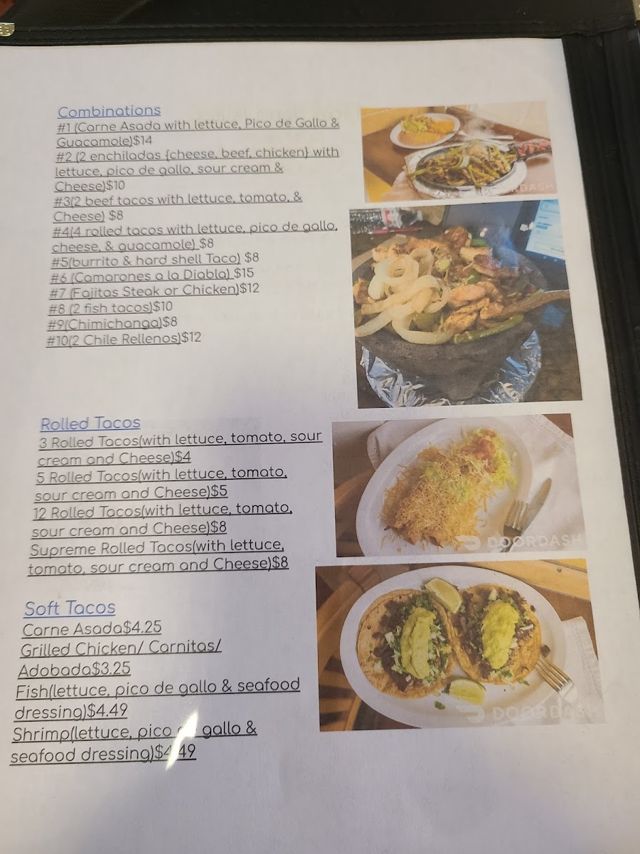 Grilled Chicken, Steak, Shrimp, Chorizo, grilled bell pepper, onions and tomato with a side or beans and rice and your choice of flour or corn tortillas.